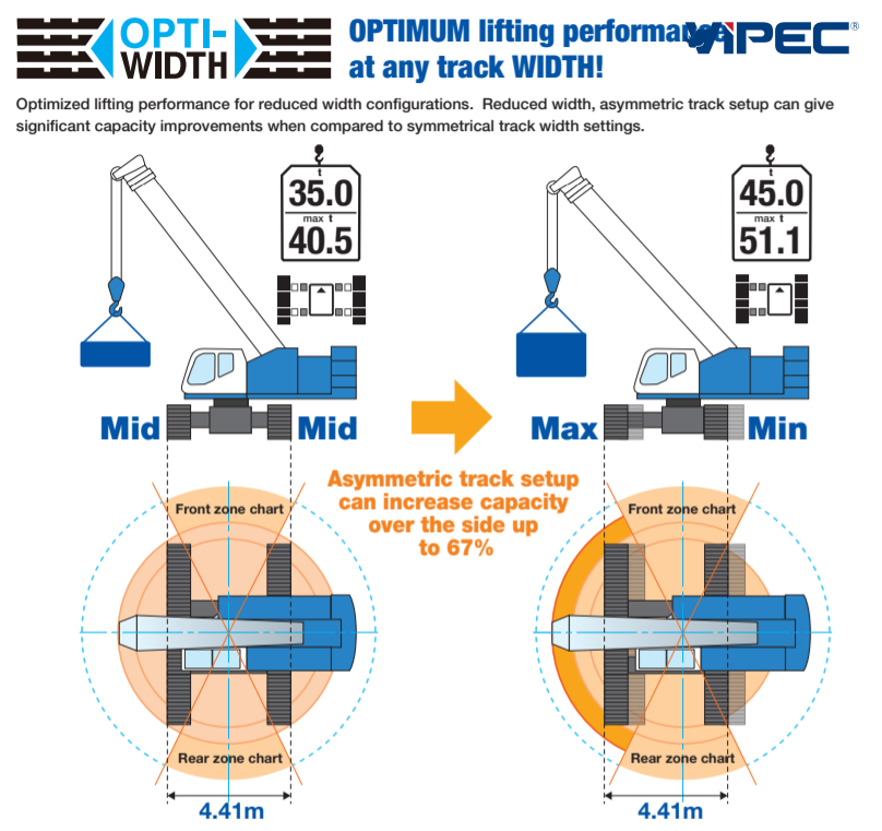 Tối ưu hiệu suất nâng trong các cấu hình chiều rộng thu gọn. Thiết lập bánh xích bất đối xứng giúp tăng đáng kể khả năng nâng so với cấu hình bánh xích đối xứng, mang lại sự linh hoạt và hiệu suất cao hơn trong không gian hẹp.
