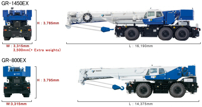 GR-1450EX có thân xe 3 trục nhỏ gọn, có chiều rộng và chiều cao tương tự như GR-800EX của Tadano. Thiết kế này giúp cải thiện khả năng cơ động và cho phép di chuyển trong không gian hẹp hơn.