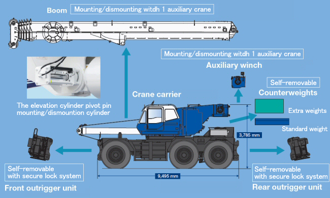 GR-1450EX được trang bị nhiều hệ thống lắp ráp và tháo dỡ để hỗ trợ di chuyển và vận chuyển. Chỉ hệ thống lắp/tháo cần trục là tùy chọn.